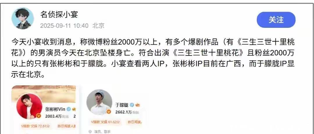 消息來得又快又猛,像一顆深水炸彈。最先是一位北京網(wǎng)友,用誰都懂的縮寫在網(wǎng)上喊話,緊接著,專門挖料的狗仔也放出猛料,點(diǎn)名道姓地說,就是那個(gè)演過《三生三世十里桃花》、粉絲兩千多萬的男演員,在北京出事了。一時(shí)間,猜測、震驚、不信,各種情緒在網(wǎng)上翻涌。