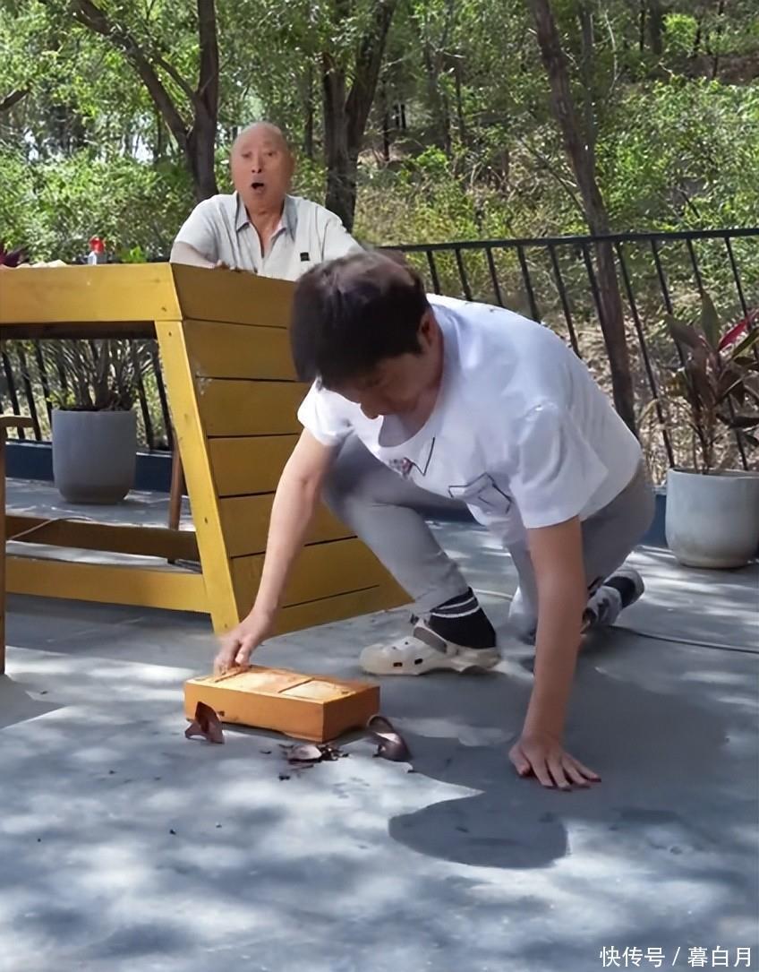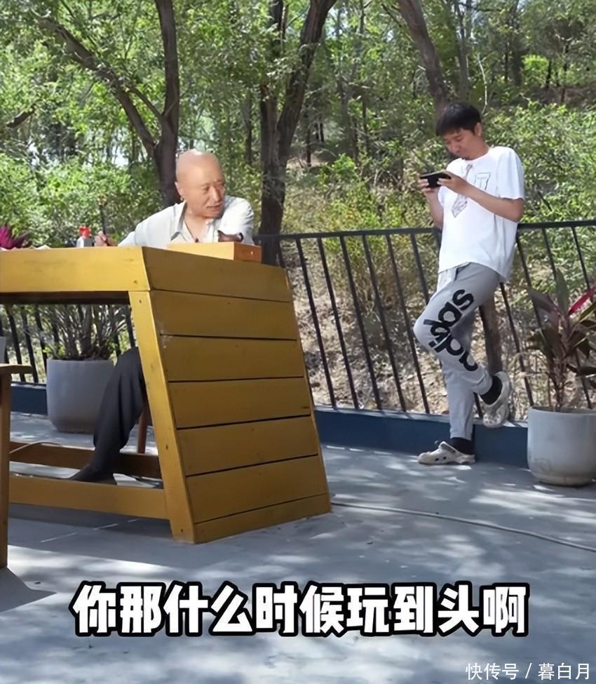 只见陈老先生端坐在那练习书法,而儿子则是站在一旁专心玩手机。小编感觉全国的父亲是不是都这个德行,明明心里不想让儿子吃一点苦,但外表又要装出一副“恨铁不成钢”的严肃样子。