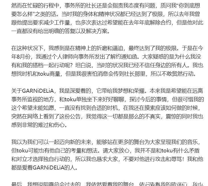 回到小美发布得信息,我们就会发现,他们这几年在东大火出圈后直接接了各种广告,甚至直接晕头转向和哭泣的,可见难度和火确实是相辅相成。只不过在这样的困难下,还要被经纪公司的社长(佐久間 剛)指责态度有问题等情况,甚至因为工作太多而希望能减少工作量的时候也没有保护好自己,可见经纪公司确实不为艺人考虑得话确实很容易被艺人要求解约呢。直接被广大中日阿宅吐槽:“这家经纪公司恭喜你,已经上了我的黑名单;我一觉醒来这么大事情我人麻了;不是这有点太突然了;可惜了还没攒够钱去看演唱会”等等,可见这次的GARNiDELiA事件确实让阿宅对这家经纪公司很伤心呢。在写稿前个小时候缘叶就看到了该信息,目前这件事肯定还在进行中,至于未来的走向如何也只好等GARNiDELiA他们发布和公开重要的信息了。那今天的瓜就聊到这里,晚安。