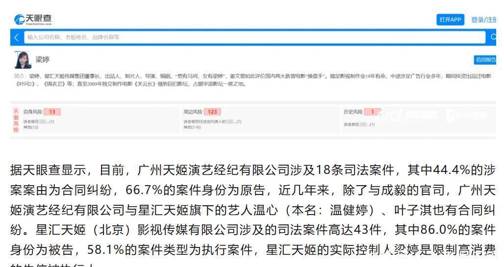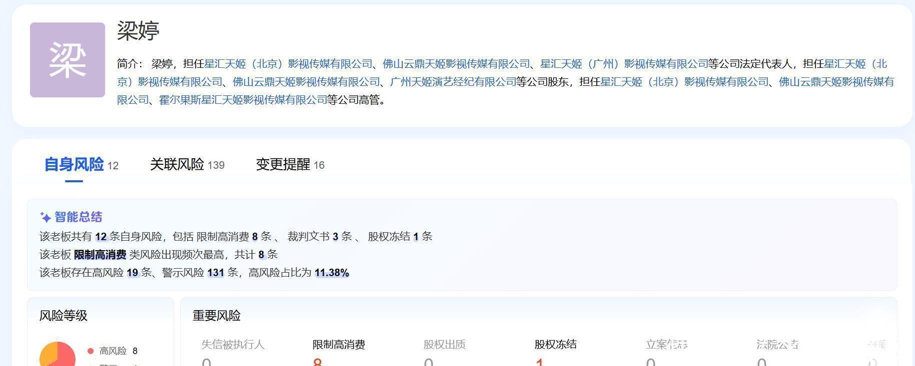 與梁婷相關(guān)的、離現(xiàn)在時間最近的一則訴訟,屬于民間借貸糾紛、借款合同糾紛,而首次執(zhí)行的案由竟是“有履行能力而拒不履行生效法律文書確定義務(wù)”。翻譯成大白話,梁婷找人借了錢,但她明明有能力償還卻拒不執(zhí)行法院判決。這樣的行為,真的當(dāng)?shù)闷稹傲x薄云天”四個字嗎?小編凌亂了。據(jù)愛企查APP顯示,梁婷共擔(dān)任3家公司的法定代表人,在3家公司任股東,在3家以上的公司擔(dān)任高關(guān),在她身上共有12條自身風(fēng)險,包括限制高消費8條、裁判文書 3 條、股權(quán)凍結(jié)1條。