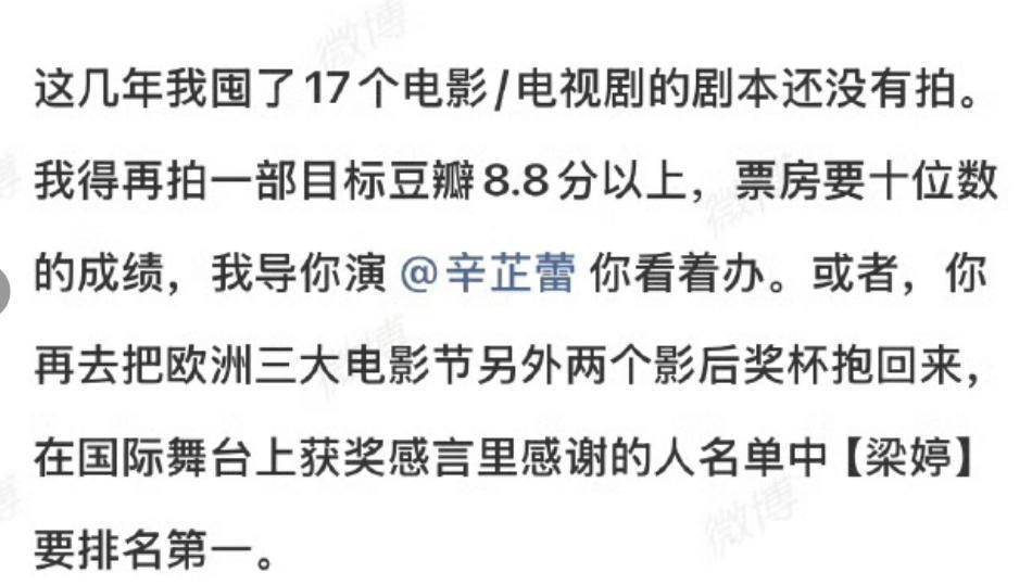 在查閱到這個信息時,本小編也是非常錯愕的。欠下這么多錢不還,梁婷女士卻在長文里說自己還囤了17個電影/電視劇還沒有拍,她還放下豪言,要自己執(zhí)導(dǎo),拍一部豆瓣8.8分以上的電影,票房要十位數(shù)的成績。這,真的可能會實現(xiàn)嗎?