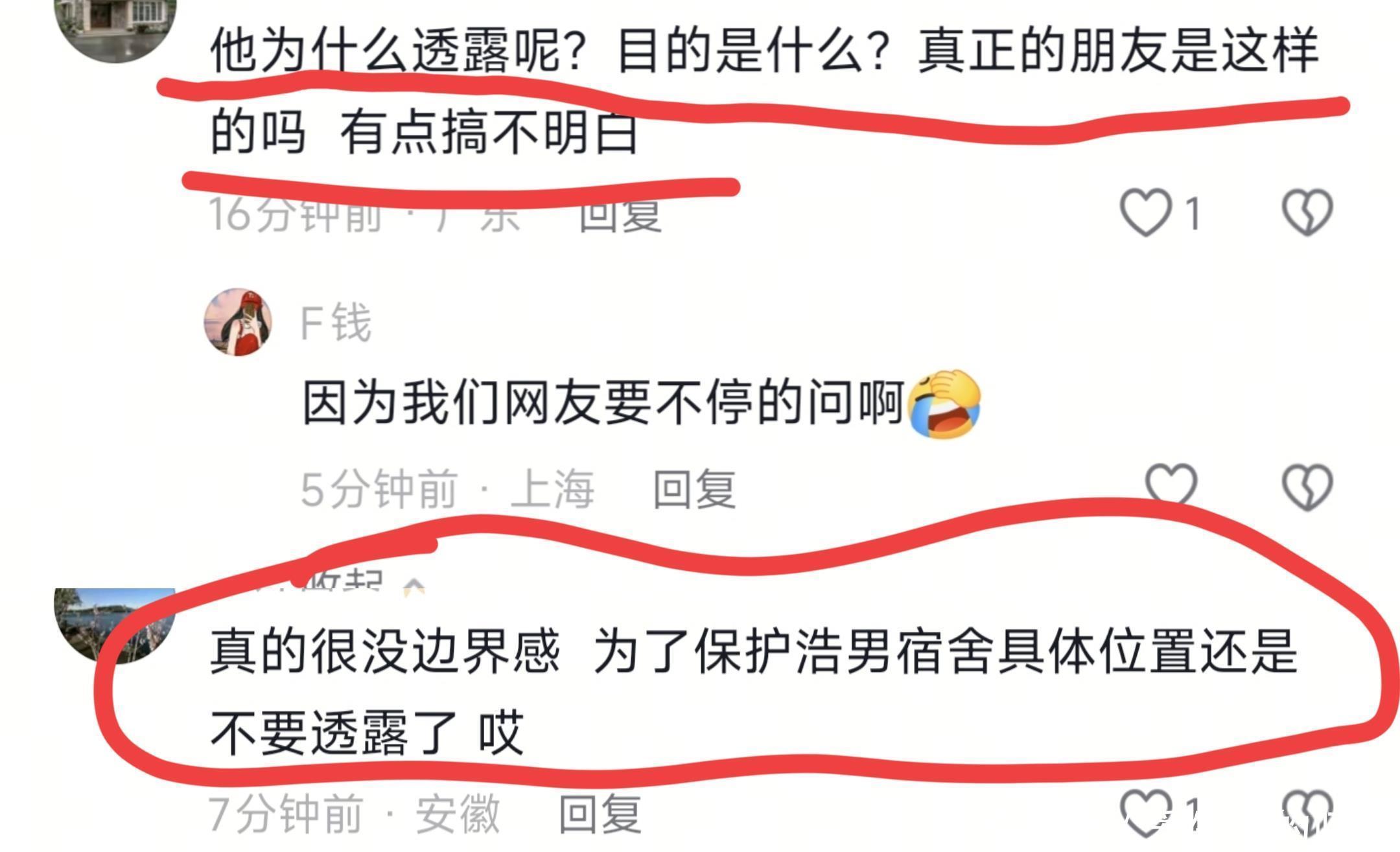 有人回復(fù):有點沒有邊界感,浩男宿舍位置不應(yīng)該透露,不然很多人知道浩男宿舍具體位置都來找浩男勢必會影響他學(xué)業(yè)以及宿舍其他同學(xué)休息!