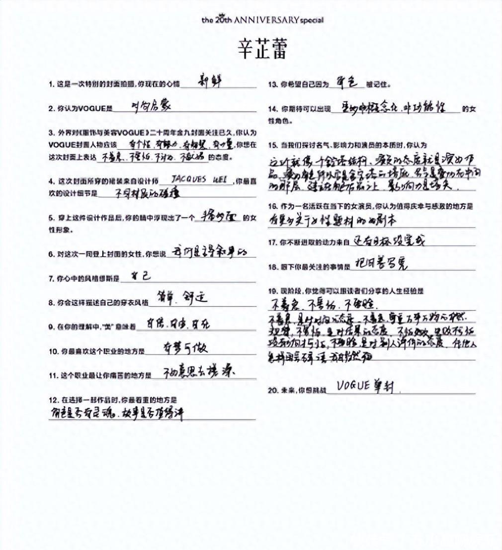 “不著急,是對(duì)時(shí)間的態(tài)度,不著急,尊重萬事萬物的自然規(guī)律;不害怕,是對(duì)結(jié)果的態(tài)度,不怕失敗,失敗不可怕,沒有方向才可怕;不要臉,是對(duì)別人評(píng)價(jià)的態(tài)度,任他人怎樣的閑言碎語(yǔ),我自巋然不動(dòng)?!边@是VOGUE問卷中關(guān)于“向讀者們分享的人生經(jīng)驗(yàn)”辛芷蕾寫下的答案。