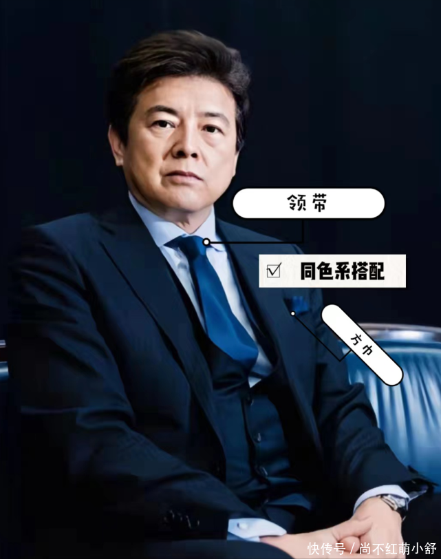 不是只能穿黑白灰,而是要会用沉稳色做搭配。三浦友和的深蓝色西装+浅蓝色西装、颜色搭配在一起,整体协调不突兀,才显高级。而且深蓝色给人一种沉稳、深邃的感觉,穿在三浦友和身上,经典又帅气。