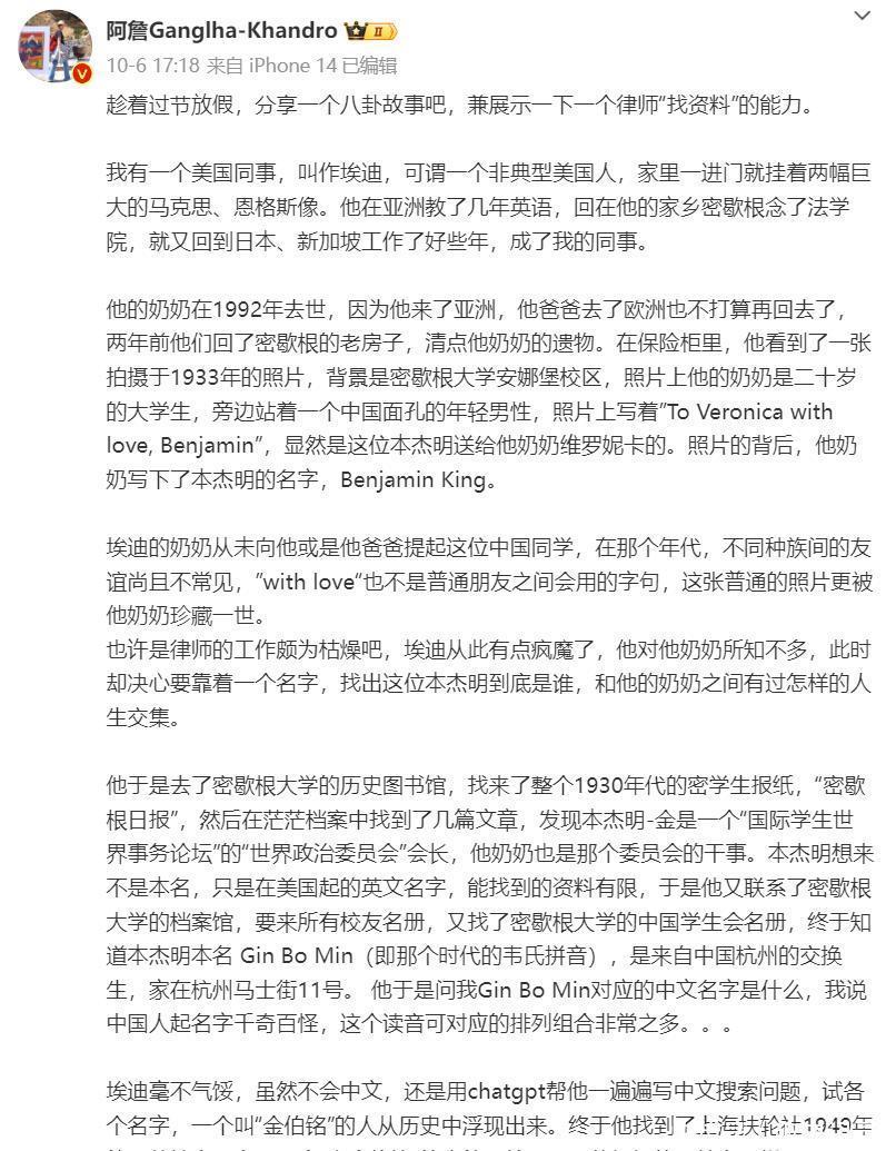 2024年10月6日,2018華語辯論世界杯總冠軍詹青云在微博上發(fā)文,聲稱自己的美國同事埃迪正在尋找關(guān)于金伯銘的線索。就此,由詹青云將埃迪尋找金伯銘的事跡曝光了,在網(wǎng)絡(luò)上引起了大量的關(guān)注。