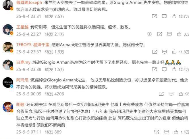 他的公司对外公布了这个消息后,咱们中国明星的反应速度居然能那么快……据网友观察,阿玛尼公司分发布讣告,几分钟后便有明星相继发文,速度之快令人惊讶。
