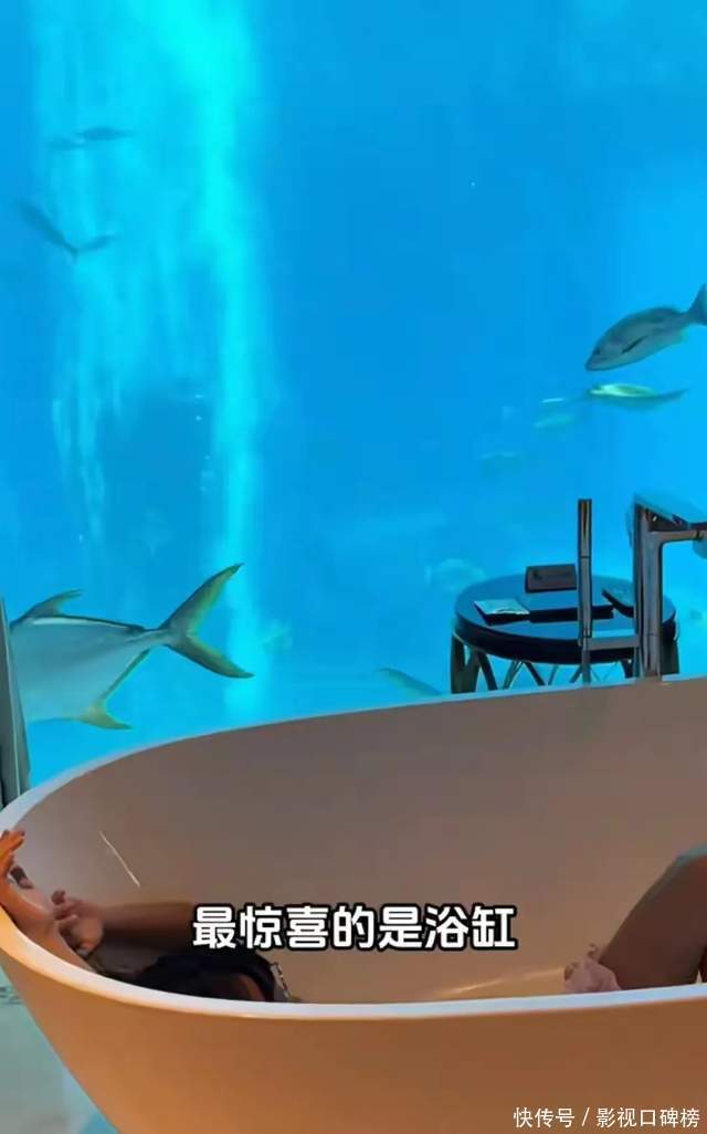 躺在浴缸里也能够看到海底世界,米粒直接躲在里面,小姑娘很享受的样子。她说:爸,你实在是太好了,我要做你一辈子的追随者!