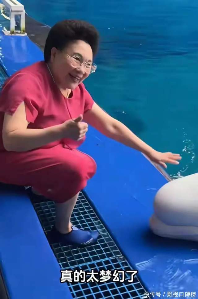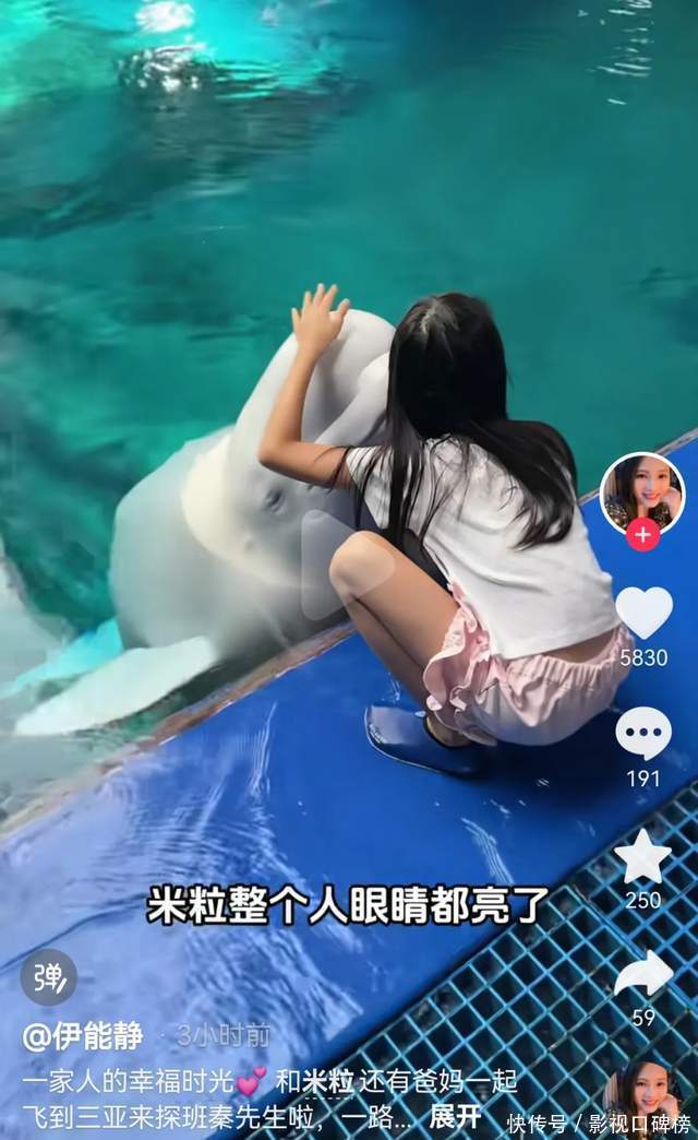 伊能静还带着公婆与米粒一起看白鲸,还摸着白鲸的大脑袋,笑得合不拢嘴。