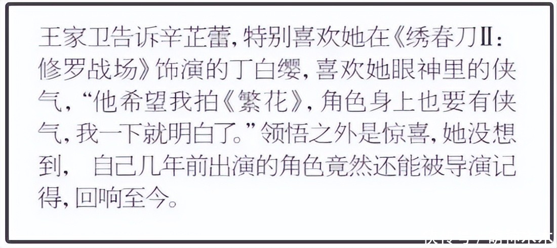 辛芷蕾和楊冪緣分不淺,當(dāng)年楊冪作為二番女主出演《繡春刀II》,最后出圈讓觀眾記住的是辛芷蕾的“刀”,隨后辛芷蕾憑借這一片段獲得王家衛(wèi)青睞出演《繁花》。