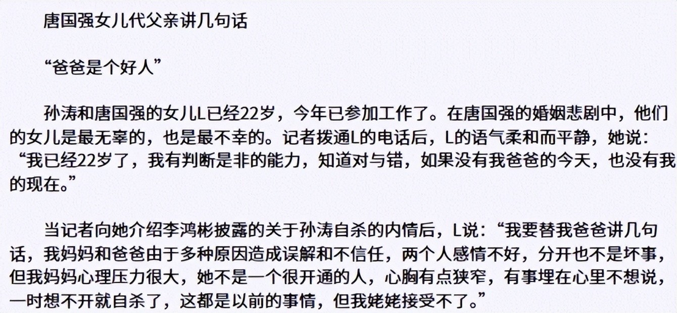 据称,唐国强的前妻性格较为内向,加之长期承受较大的精神压力,这才酿成悲剧。可想而知,如果唐国强真的因出轨导致母亲自杀,那么他的女儿肯定不会站出来为其辩护。