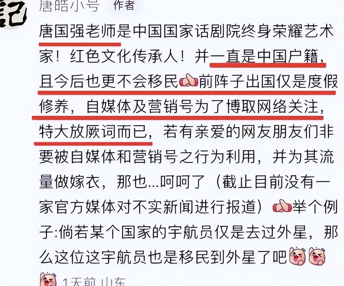 罗玉凤曾在社交平台上发布了一张过海关的照片。有人据此断言唐国强也已前往美国。但实际上,其经纪人早已在网络平台上澄清,唐国强并非美国公民,且绝不会申请美国国籍。